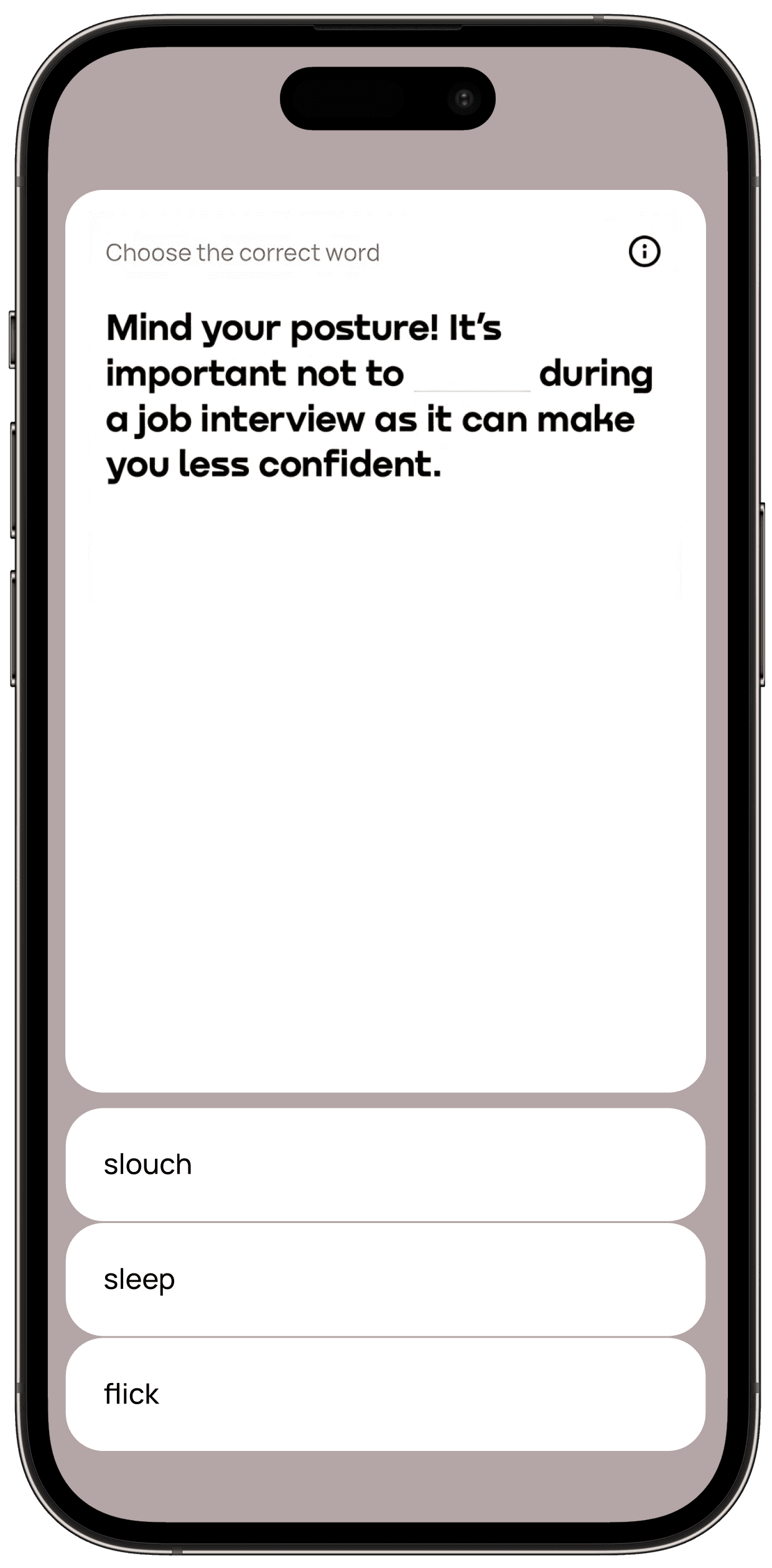 After you answer a few quick questions about your learning goals, you’ll get access to an English course at your current level. The course will include grammar, vocabulary, and language use, such as English tenses exercises. You can also find specific topics such as business English or TV shows as separate courses. Every module includes practice with different language aspects - you’ll learn to use words, discover helpful phrases, apply grammar rules, and so on.