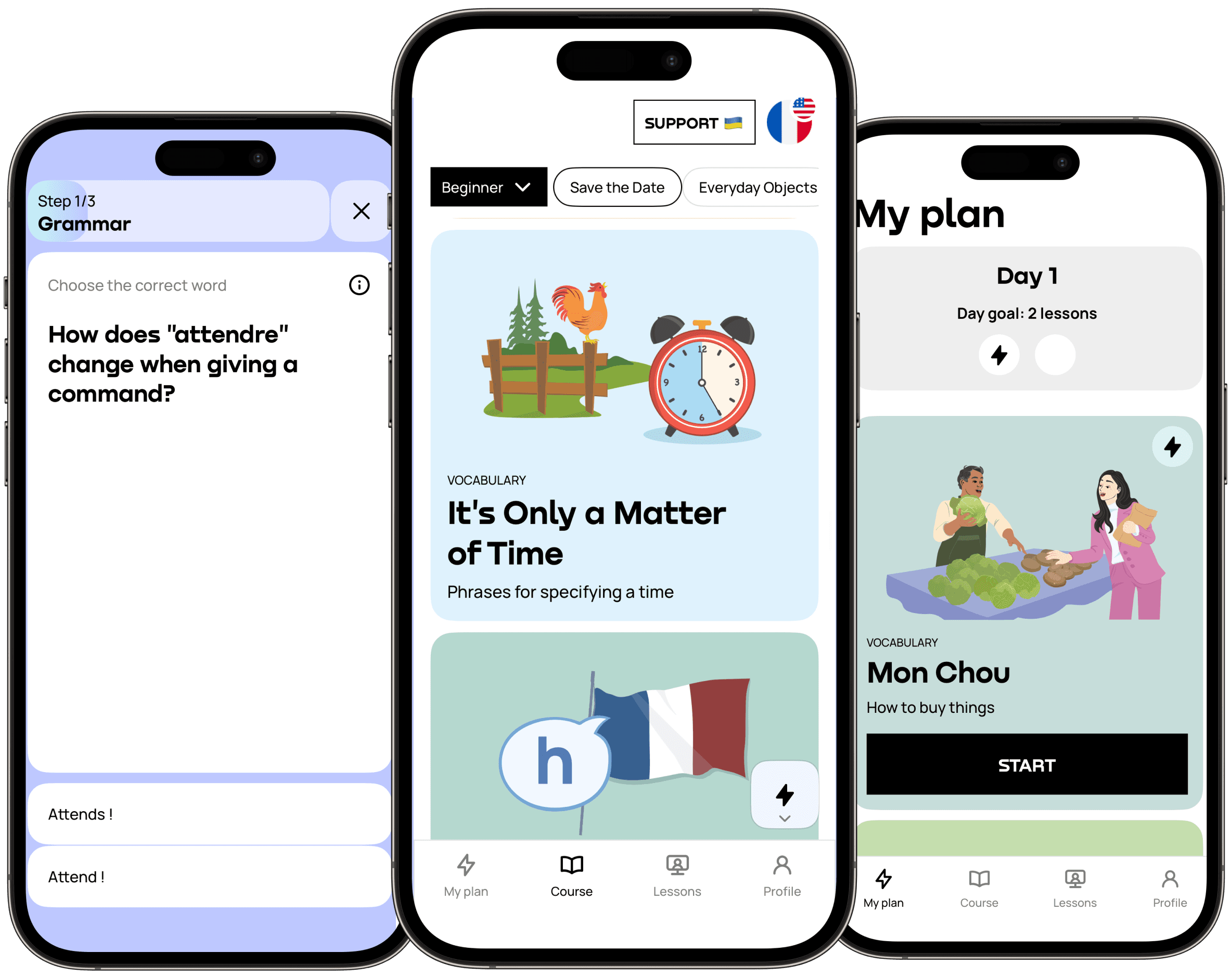 Want to master French for both casual chats and business conversations? Start learning French with Promova’s practical online courses, real speaking practice, and fun and interactive exercises, flashcards, and quizzes.