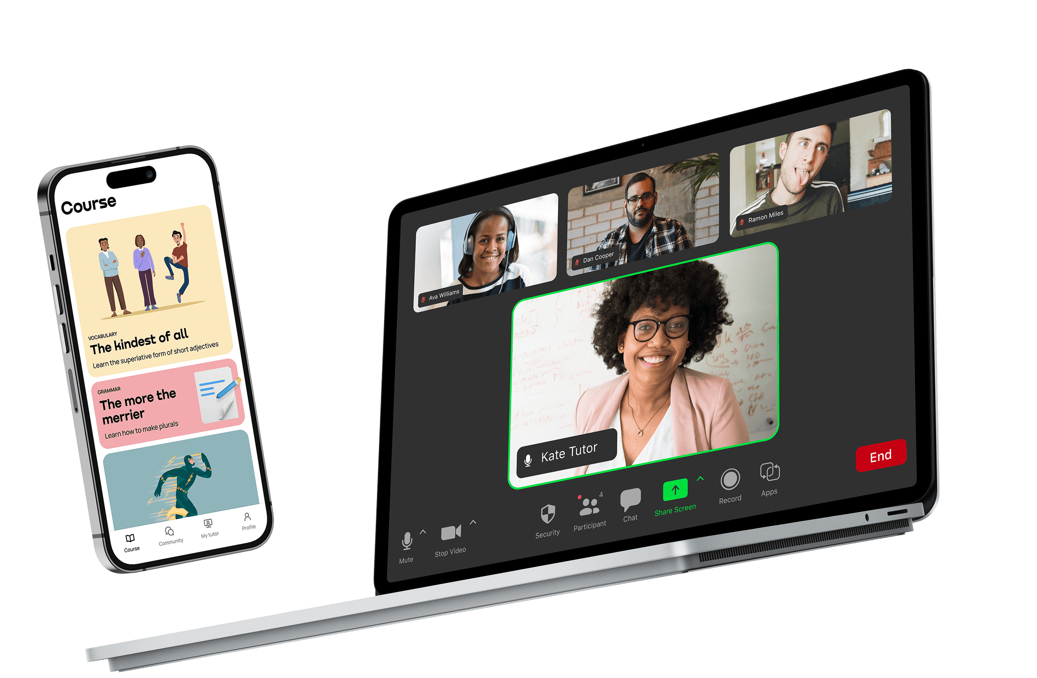✔ All-in-one platform: app, English level evaluation, analytics, certification
